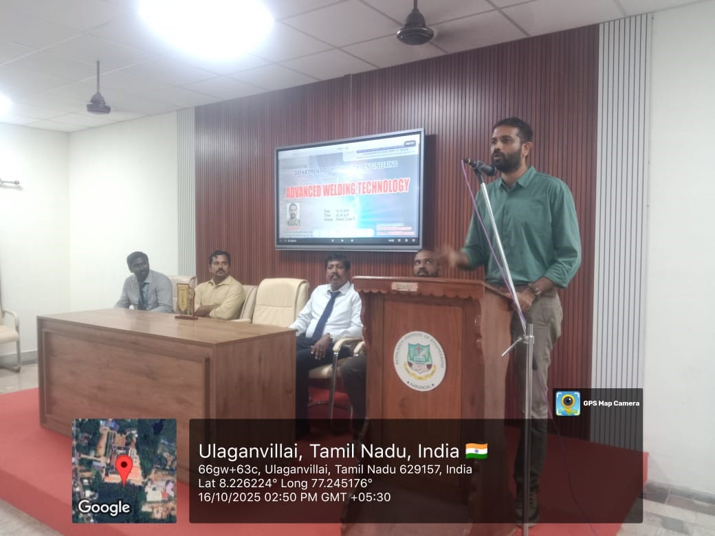 On 16th October 2025, the Department of Mechanical Engineering organized a Guest lecture on “Advanced Welding Technology” at 2:30 PM II, III, IV YR & I YR PG, II YR PG mechanical students. The program began with a welcome address by Mr. Shahanshad, a third-year Mechanical student, followed by the felicitation address delivered by Dr. N. Nirmal Singh, the Principal. The chief guest, Mr. Anoop, a Senior Certified Welding Inspector (AWS SCWI), NACE Level II certified, and API 510 inspector from Armstech Engineering Pvt Ltd, Cochin, was introduced by Mr. G.S Arun, a second-year Mechanical student. Mr. Anoop delivered an insightful lecture on advanced techniques and innovations in welding technology, sharing his valuable expertise with the students. The session concluded with a vote of thanks by Mr. J. Berlin, a final-year Mechanical student. As a token of appreciation, the Principal presented a memento to the chief guest, marking the successful completion of the event.