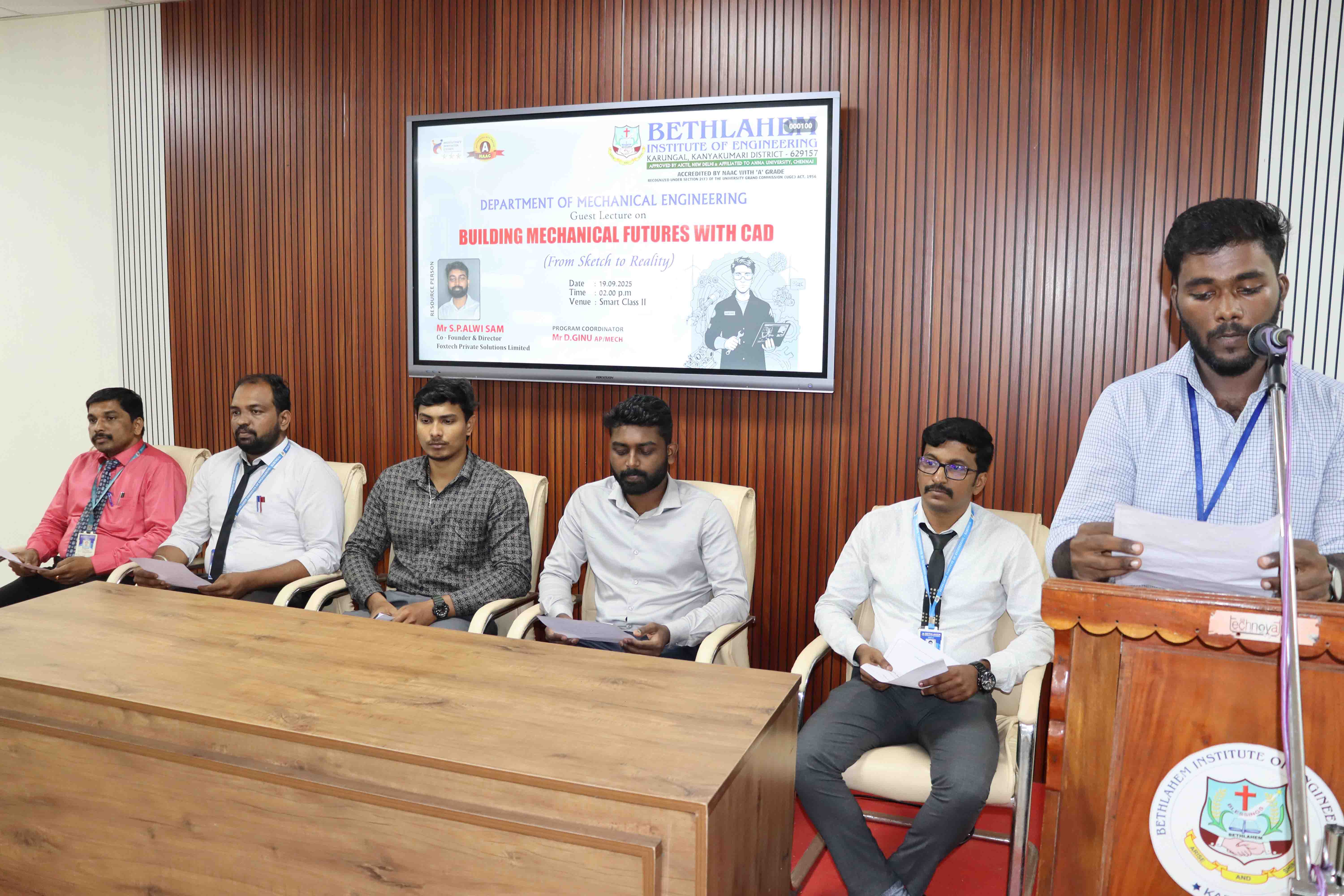 The Mechanical Engineering department of Bethlahem Institute of Engineering has organized a Guest Lecture on “Role of Mechanical Engineering in Future and infrastructure in Indian Automotive Industry” on 31st July, 2023. This guest lecture laid a path to get more information about the various role of mechanical engineers in future and the way to get innovative ideas about the functions of automotive industry and the role of mechanical engineers in future mobility and infrastructure in indian automotive industry. Mechanical engineers are responsible for the design, planning and execution of new automotive components. Mechanical engineers research and develop new designs and technologies for existing or new vehicles.
