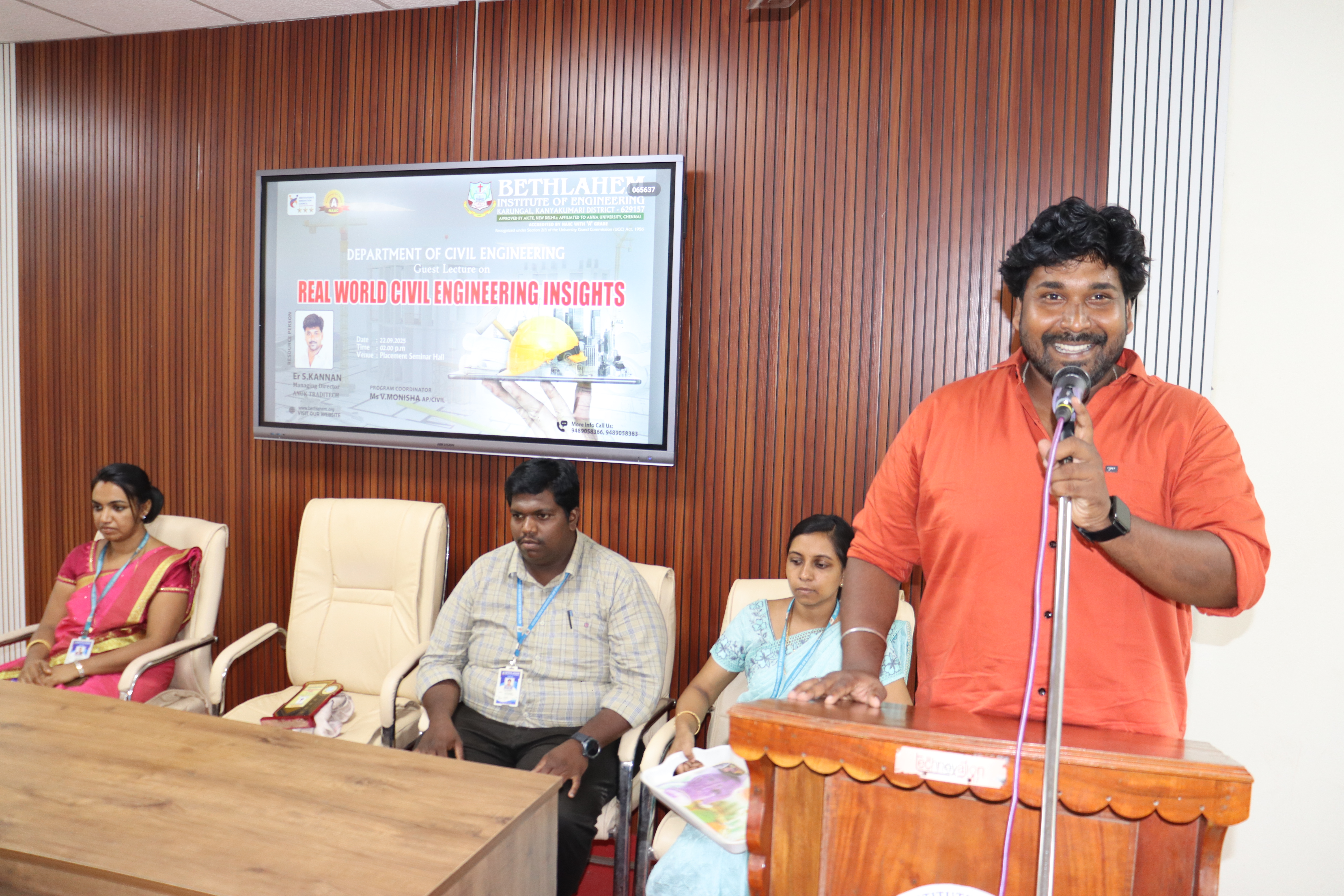 A guest lecture on “Real World Civil Engineering Insights” was conducted by the Department of Civil Engineering on 22nd September 2025 at 2:00 PM at Bethlaham Institute of Engineering. The session featured an inspiring address by the distinguished guest speaker, Er. S. Kannan, Managing Director of Anuk Traditech, who shared his rich practical knowledge and professional experiences from the field of Civil Engineering. His talk offered students a comprehensive understanding of the latest industry trends, the challenges faced in the profession, and the expectations awaiting future engineers. The students actively participated in the interactive session, making it a highly informative and motivating experience.